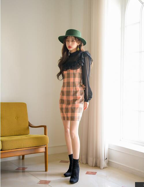 韩国官网款체크오픈숄더OPS