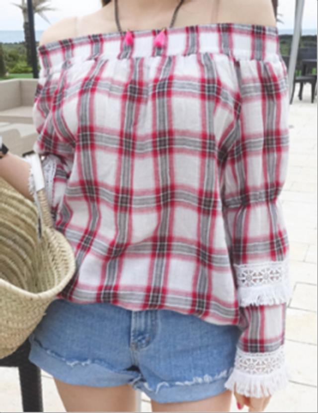 韩国官网款女装-上衣체크오프숄더블라