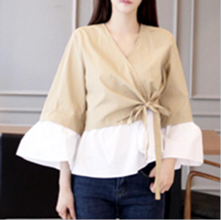 韩国官网款女装-上衣랩배색블라우스